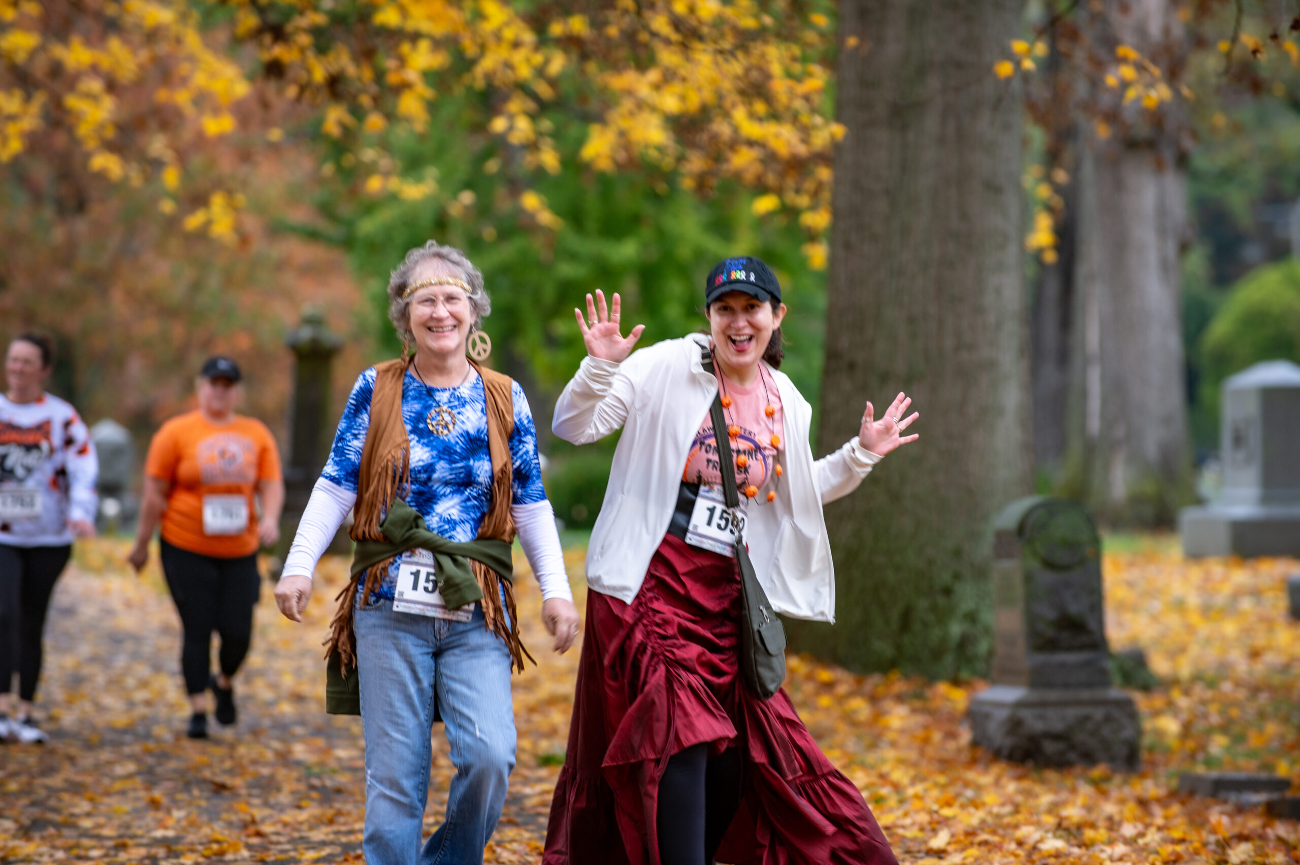 The event draws a wide crowd—seasoned 5K runners looking to try something different, families pushing strollers, students, local organizations, and community members committed to supporting the cemetery’s mission. Many participants embrace the theme by dressing in light Halloween-inspired costumes or Tombstone Trot T-shirts, adding a fun and festive spirit to the morning. After the race, attendees often stay to enjoy refreshments, take photos by some of the cemetery’s most iconic monuments, and learn more about ongoing preservation projects.